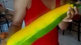 Comment on this photo:My sister holding the biggest zucchini ever